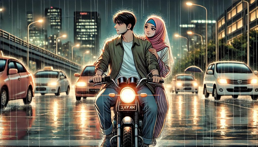 Qayyim hanya mengangguk, membantu Aamal duduk selesa di belakang sebelum menekan pendikit. Perjalanan pulang itu sunyi, hanya bunyi hujan yang mengetuk-ngetuk visor topi keledar mereka.