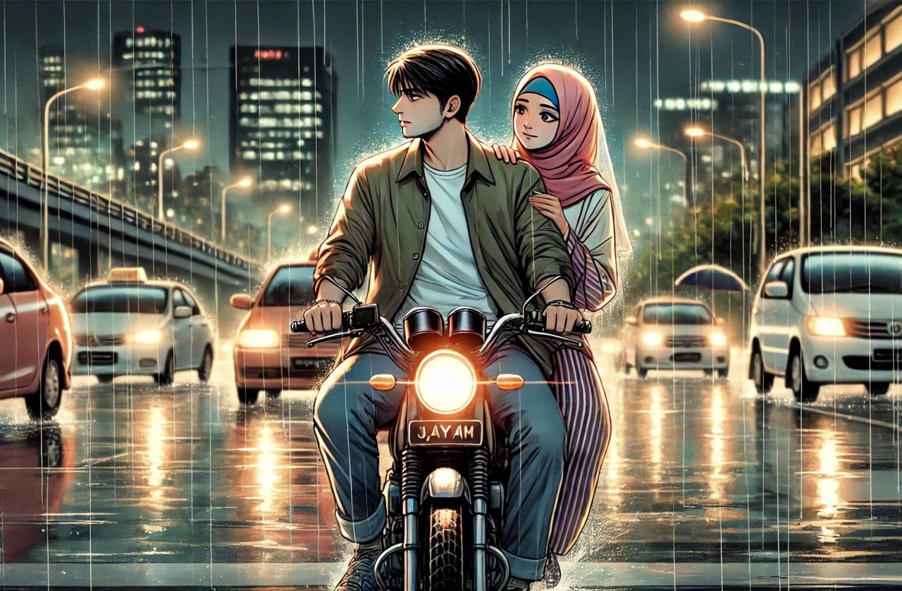 Qayyim hanya mengangguk, membantu Aamal duduk selesa di belakang sebelum menekan pendikit. Perjalanan pulang itu sunyi, hanya bunyi hujan yang mengetuk-ngetuk visor topi keledar mereka.