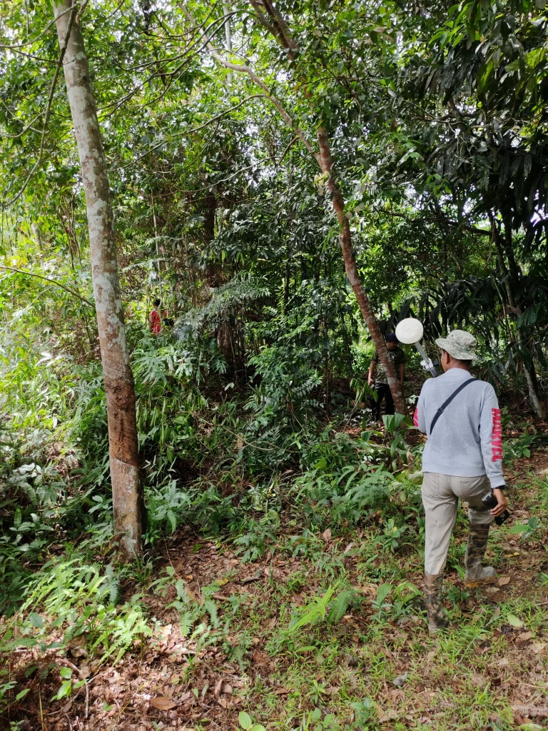 What was once just a line in a Faraid document was now alive before us, a thick hutan with towering trees, scattered oil palms, and even pokok getak, their tall trunks reaching up like guardians of the past. A small stream whispered its way through the underbrush, cutting through the silence like a forgotten song. The air was thick with the scent of earth and leaves, and the sun filtered through the canopy in golden shafts.